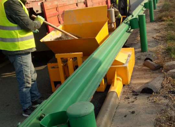 小型攔水帶機主要是指其能生產出的攔水帶尺寸較小,一般不超過25*25cm.機器設計緊湊,體型較小,特別適合高速路面護欄板下小型攔水帶施工。一人控制方向,一人上料,一人收尾即可。操作簡易上手快。